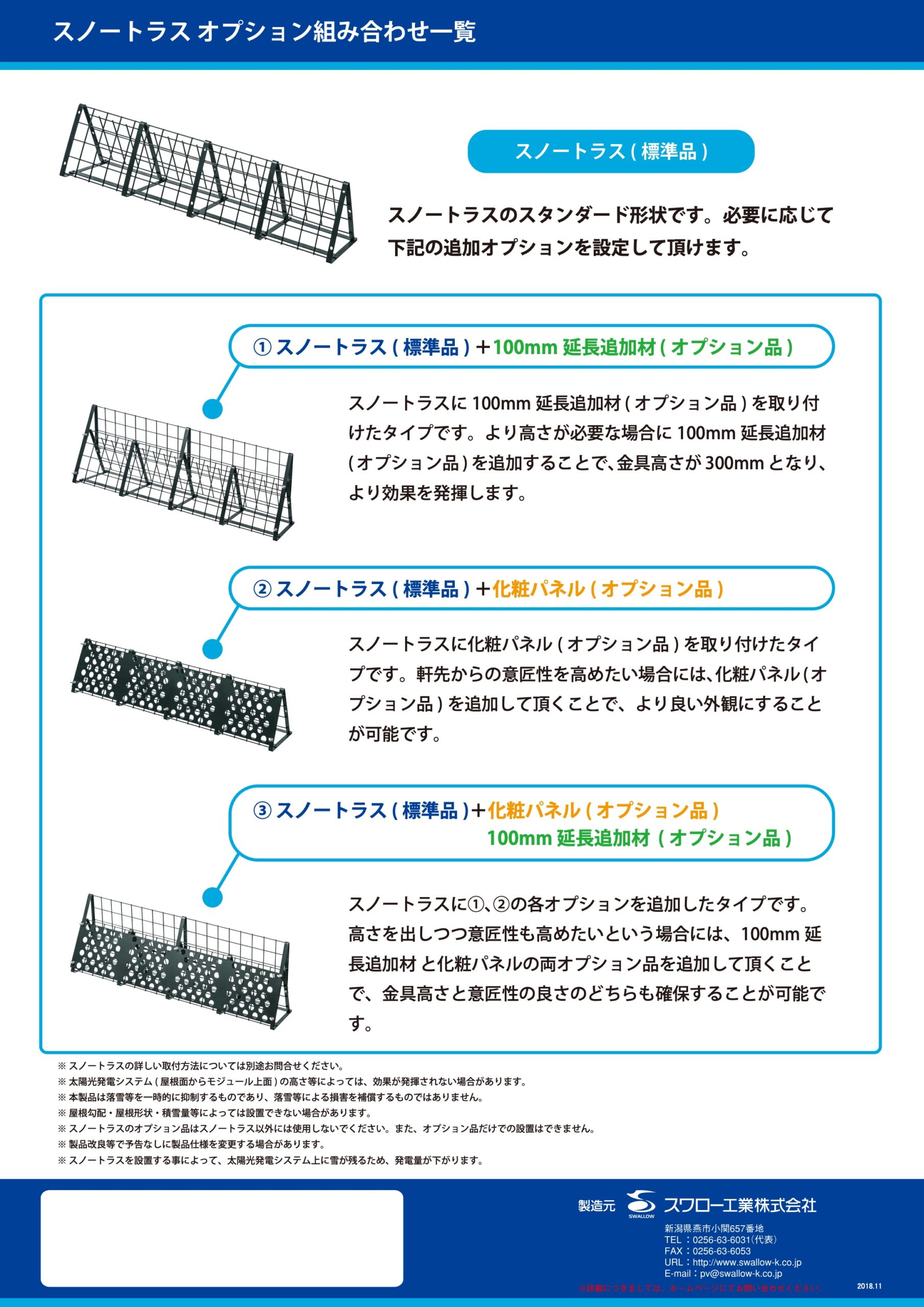 太陽光パネルの表面は滑らかでとても滑りやすい材質で、雪止め金具を飛び越えて落雪してましたので、太陽光パネルより雪止め金具が高くなるスノートラスを選定しました。 雪を大容量止められる分、雪止めにかかる負荷が大きくなるので受け金具を屋根駆体垂木に効かしてより強度を持たせて施工してあります。受け金具のズレ落ちなどもご安心下さい。